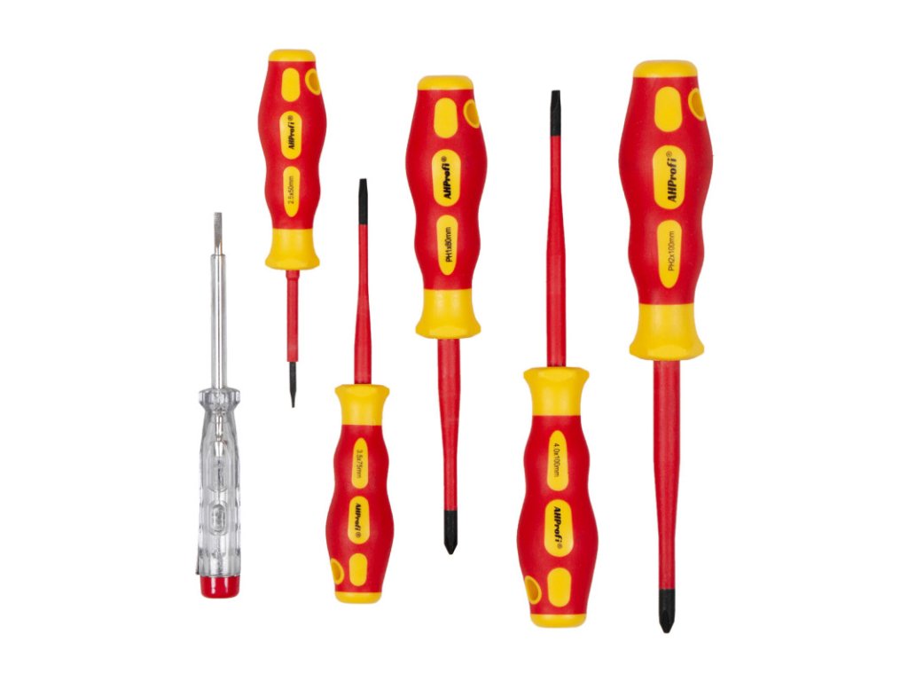 - 6dílná sada: 3 ploché, 2 křížové šroubováky a zkoušečka
