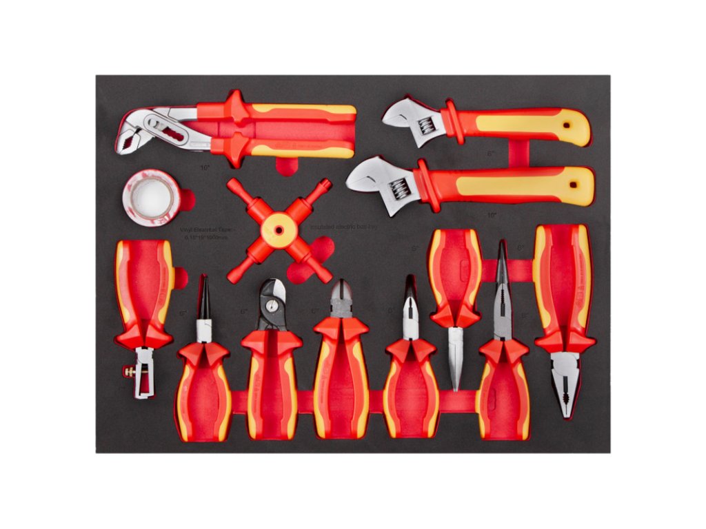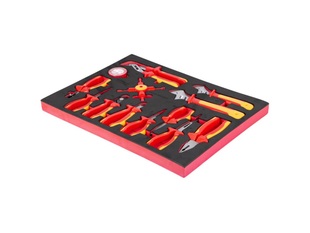 Univerzální sada izolovaného VDE nářadí pro práci s vodiči a elektrickými rozvody, uložená v praktické pěnové výplni do zásuvky dílenského vozíku.