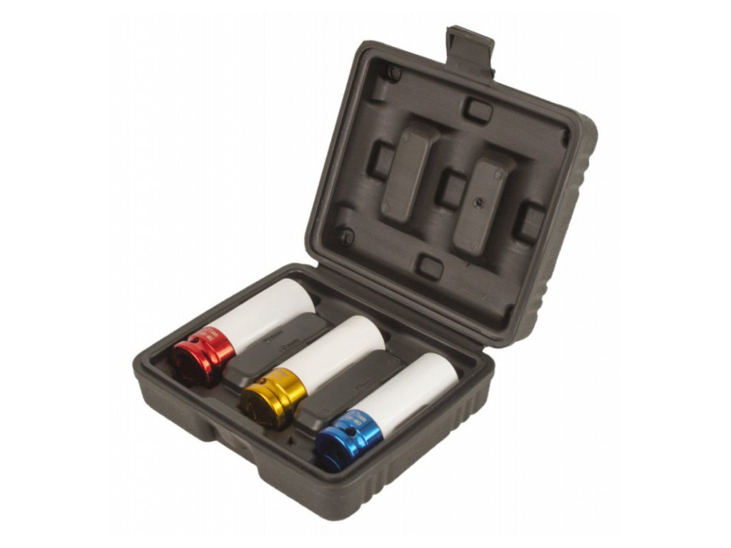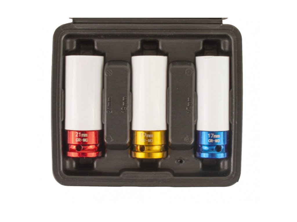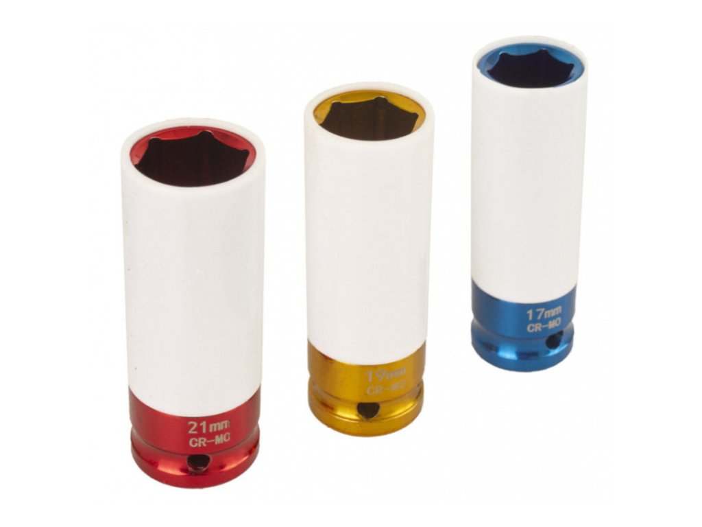 Sada obsahuje 3 ks klíčů o velikostech 17 mm (modrá), 19 mm (zlatá), 21 mm (červená) a délce 80 mm.
