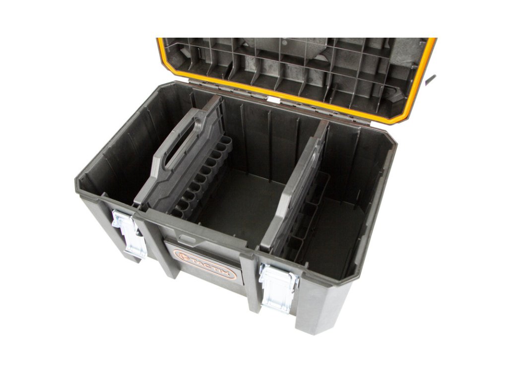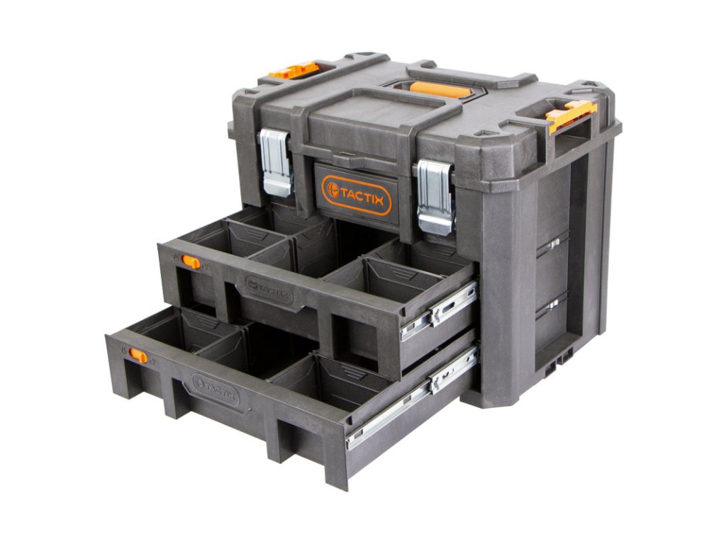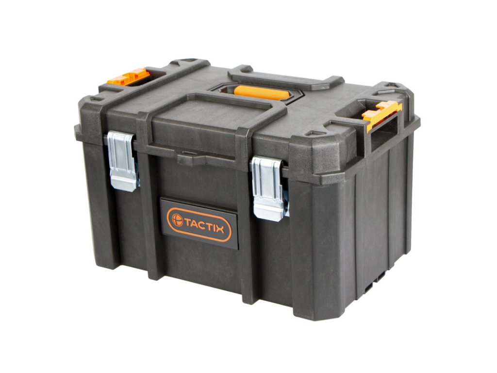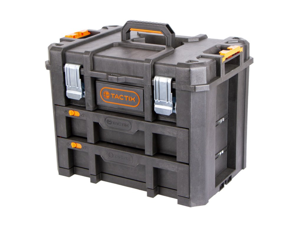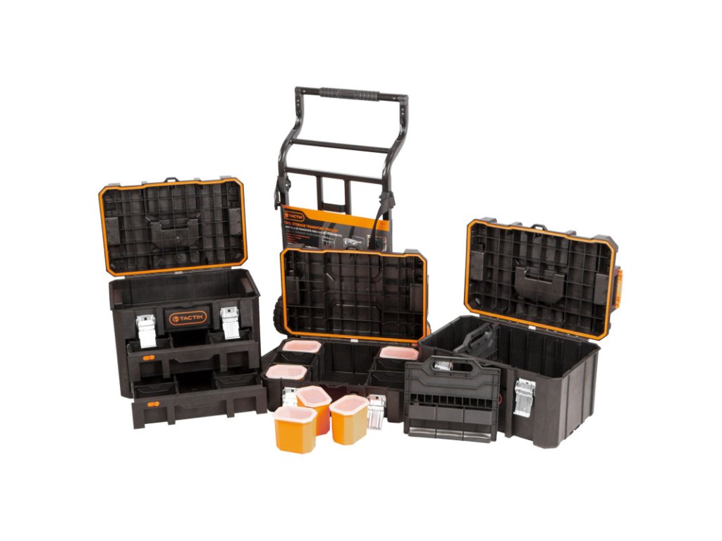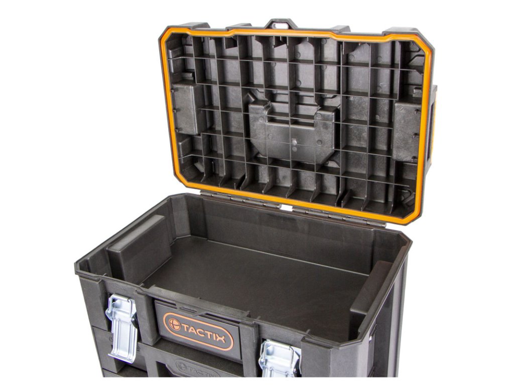Hlavní výhodou kufrů od značky Tactix je jejich variabilita úložných prostorů, vodotěsnost a snadná manipulace celé sady díky madlu a kolečkům.