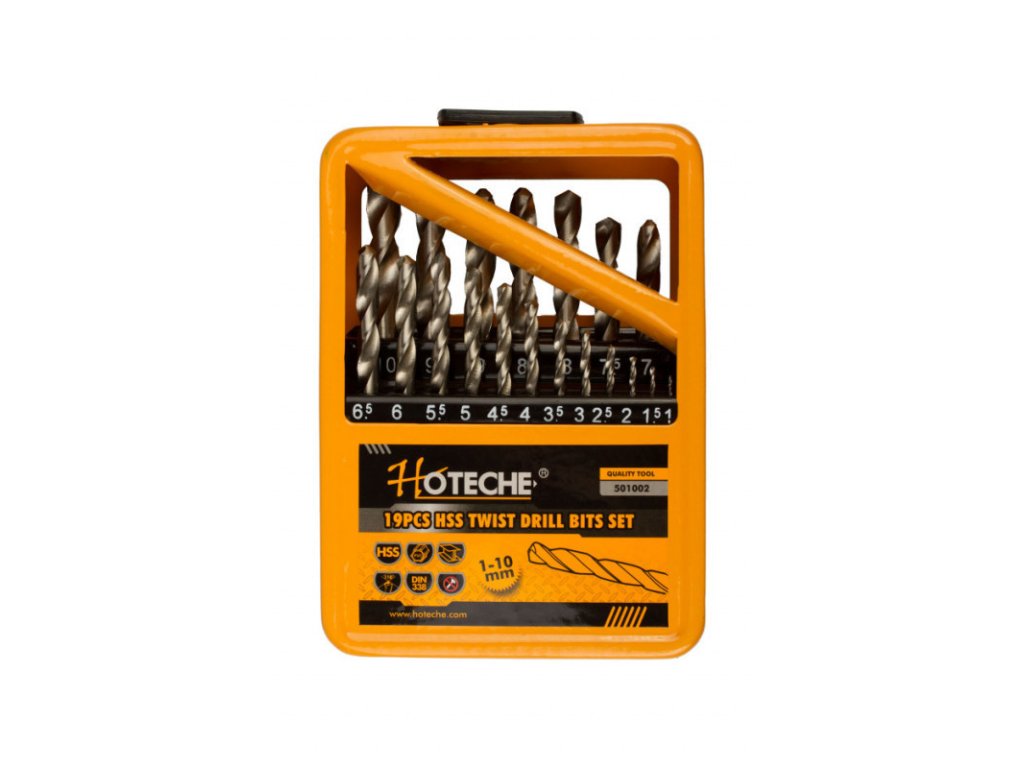 Sada vrtáků do kovu značky Hoteche z rychlořezné oceli HSS nesmí chybět v základní výbavě u žádné Stolní vrtačky i Ruční elektrické vrtačky. Sada je přehledně uložena v kovovém boxu, ve kterém naleznete 19 kusů vrtáků o velikostech 1 - 10 mm.
