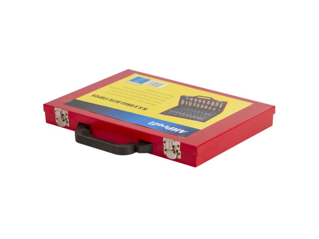 - Sada 170 vrtáků s titanovou povrchovou úpravou (dle normy DIN 338) a válcovou stopkou.