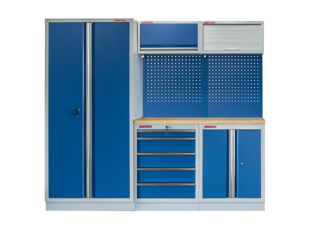 Dílenský nábytek PROFI BLUE s dřevěnou deskou zaujme moderním a profesionálním vzhledem. Kombinace modré RAL 5023 a šedé RAL 7035 barvy se bude vyjímat v každé garáži i dílně. Sestava nábytku v sobě skrývá dostatečné množství úložného prostoru pro vaše nářadí, autotechniku i dílenské vybavení. V kombinaci s bytelnou pracovní deskou získáte multifunkční stěnu, se kterou vám půjde práce od ruky ve všech směrech. Jednotlivé komponenty jsou plně konfigurovatelné, sestavu je možné dle vašich potřeb rozšířit o další skříně, regály i ponk.Sestava nábytku MTGS1301BAL01
