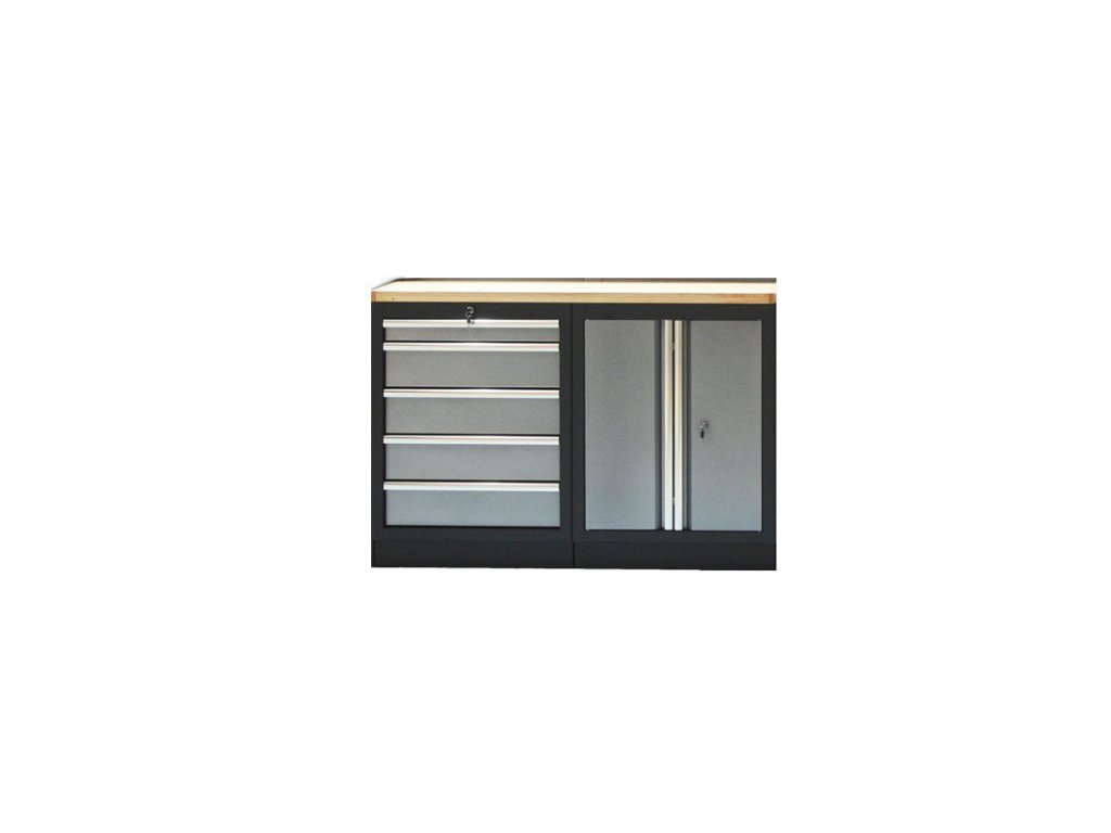 Dílenský nábytek PROFI GREY s dřevěnou deskou zaujme moderním a profesionálním vzhledem. Kombinace kladívkové šedé a černé RAL 9004 se bude vyjímat v každé garáži i dílně. Sestava nábytku v sobě skrývá dostatečné množství úložného prostoru pro vaše nářadí, autotechniku i dílenské vybavení. V kombinaci s bytelnou pracovní deskou získáte multifunkční stěnu, se kterou vám půjde práce od ruky ve všech směrech. Jednotlivé komponenty jsou plně konfigurovatelné, sestavu je možné dle vašich potřeb rozšířit o další skříně, regály i ponk.Sestava nábytku TGS1300BAL08