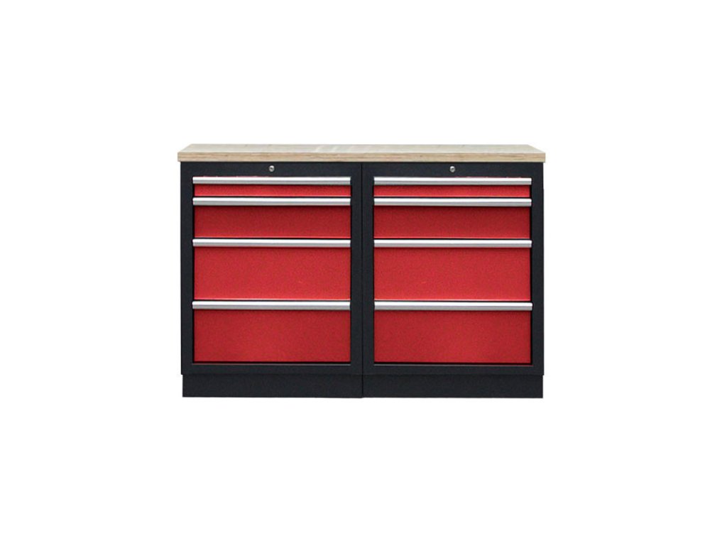 Dílenský nábytek PROFI RED s dřevěnou deskou zaujme moderním a profesionálním vzhledem. Kombinace červené RAL 3031 a černé RAL 9004 se bude vyjímat v každé garáži i dílně. Sestava nábytku v sobě skrývá dostatečné množství úložného prostoru pro vaše nářadí, autotechniku i dílenské vybavení. V kombinaci s bytelnou pracovní deskou získáte multifunkční stěnu, se kterou vám půjde práce od ruky ve všech směrech. Jednotlivé komponenty jsou plně konfigurovatelné, sestavu je možné dle vašich potřeb rozšířit o další skříně, regály i ponk.Sestava nábytku RTGS1300BAL10