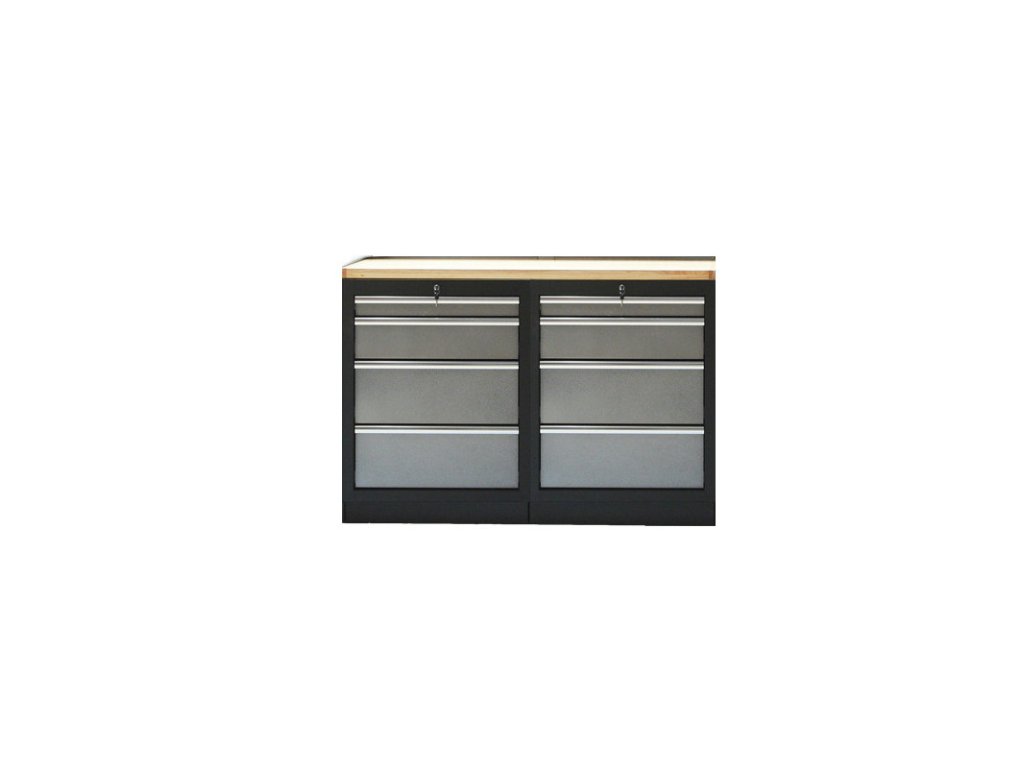 Dílenský nábytek PROFI GREY s dřevěnou deskou zaujme moderním a profesionálním vzhledem. Kombinace kladívkové šedé a černé RAL 9004 se bude vyjímat v každé garáži i dílně. Sestava nábytku v sobě skrývá dostatečné množství úložného prostoru pro vaše nářadí, autotechniku i dílenské vybavení. V kombinaci s bytelnou pracovní deskou získáte multifunkční stěnu, se kterou vám půjde práce od ruky ve všech směrech. Jednotlivé komponenty jsou plně konfigurovatelné, sestavu je možné dle vašich potřeb rozšířit o další skříně, regály i ponk.Sestava nábytku TGS1300BAL10