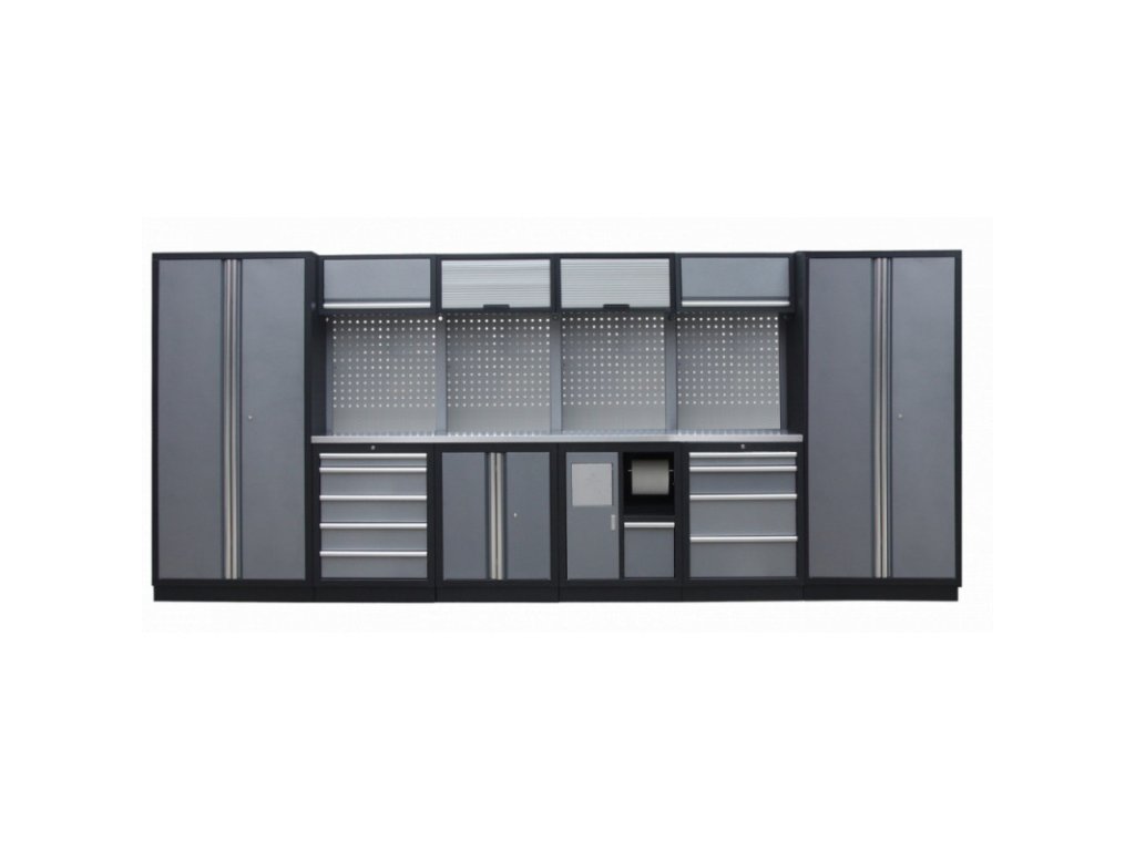 Dílenský nábytek PROFI GREY s nerezovou deskou zaujme moderním a profesionálním vzhledem. Kombinace kladívkové šedé a černé RAL 9004 barvy se bude vyjímat v každé garáži i dílně. Sestava nábytku v sobě skrývá dostatečné množství úložného prostoru pro vaše nářadí, autotechniku i dílenské vybavení. V kombinaci s bytelnou pracovní deskou získáte multifunkční stěnu, se kterou vám půjde práce od ruky ve všech směrech. Jednotlivé komponenty jsou plně konfigurovatelné, sestavu je možné dle vašich potřeb rozšířit o další skříně, regály i ponk.Sestava nábytku TGS1301AM