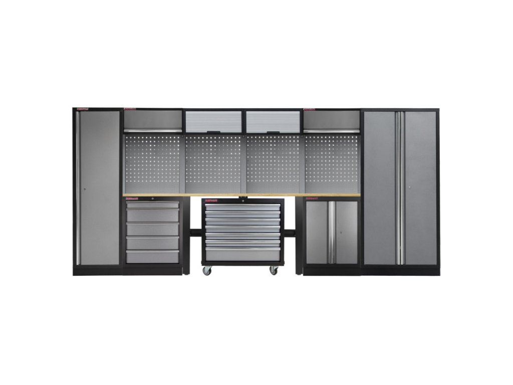 Hlavní předností sestavy je především pojízdný vozík, dvoukřídlá skříňka, úzká a široká vysoká skříň a skříňka s pěti zásuvkami do kterých můžete vložit výplně s nářadím, nebo prázdné, do kterých si vložíte své nářadí. Také nabízíme organizéry na šroubky, které se skvěle hodí na pracovní desku. Výsuvy zásuvek jsou osazeny kuličkovými ložisky.