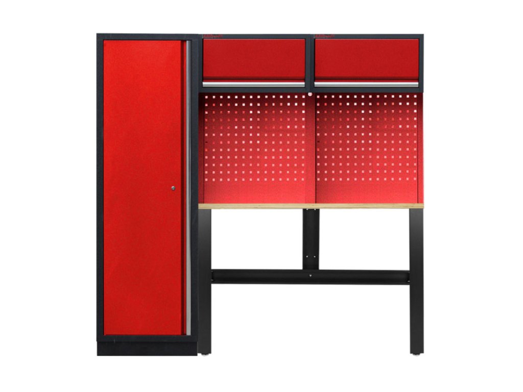 Kompaktní sestava vhodná i do menších prostor obsahuje vysokou skříň pro uskladnění různého druhu nářadí, dílenský stůl opatřen dřevěnou pracovní deskou a dvě výklopné horní skříňky.