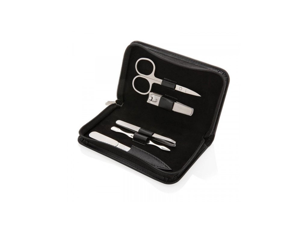 Set obsahuje pět nástrojů - nůžky i kleštičky na nehty, pilník, pinzetu a pomůcku na úpravu nehtové kůžičky.