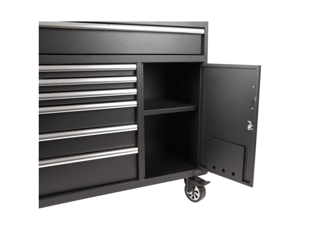 Černý široký kovový dílenský vozík se 7 šuplíky, skříňkou s nastavitelnou poličkou a bočním odkládacím prostorem je vybavený nezbytným nářadím pro práci v dílně.
