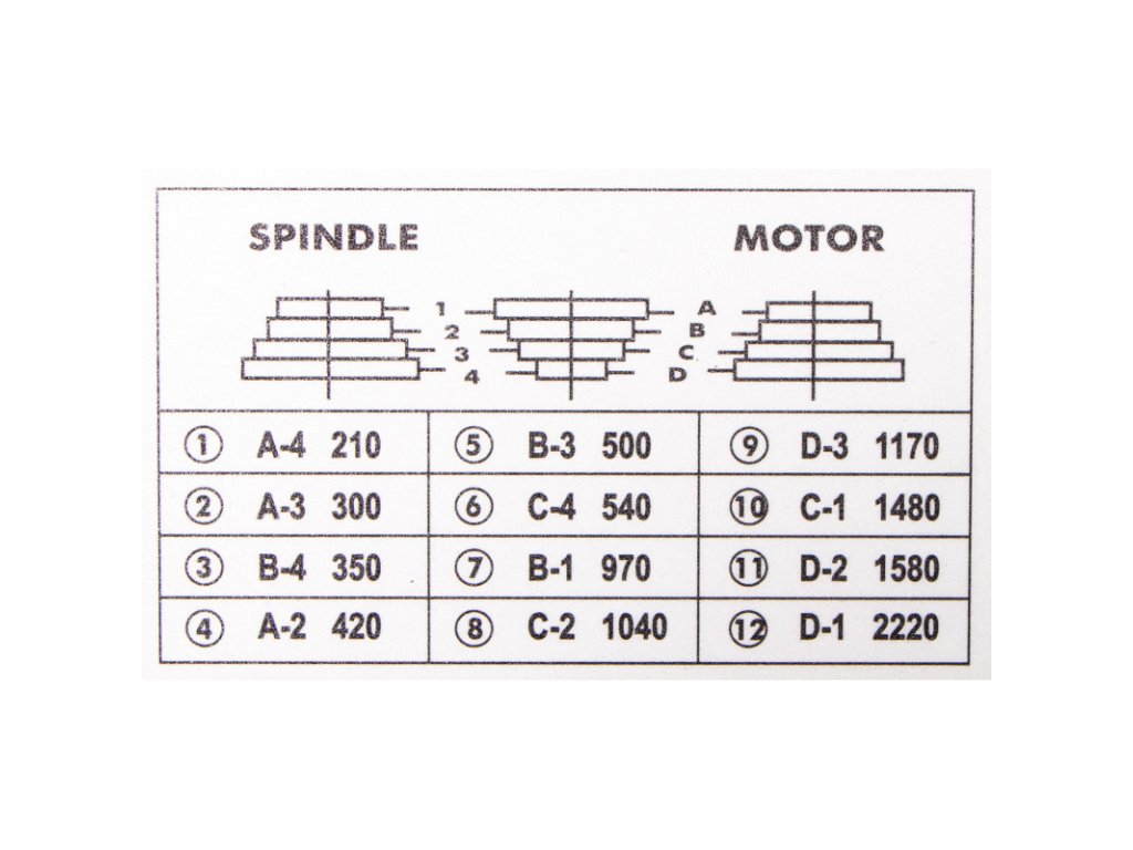 Nastavení odpovídajícího převodu otáček provedeme nastavením klínového řemene na odpovídající kola ve vřeteníku, která jsou uschovány pod krytem.