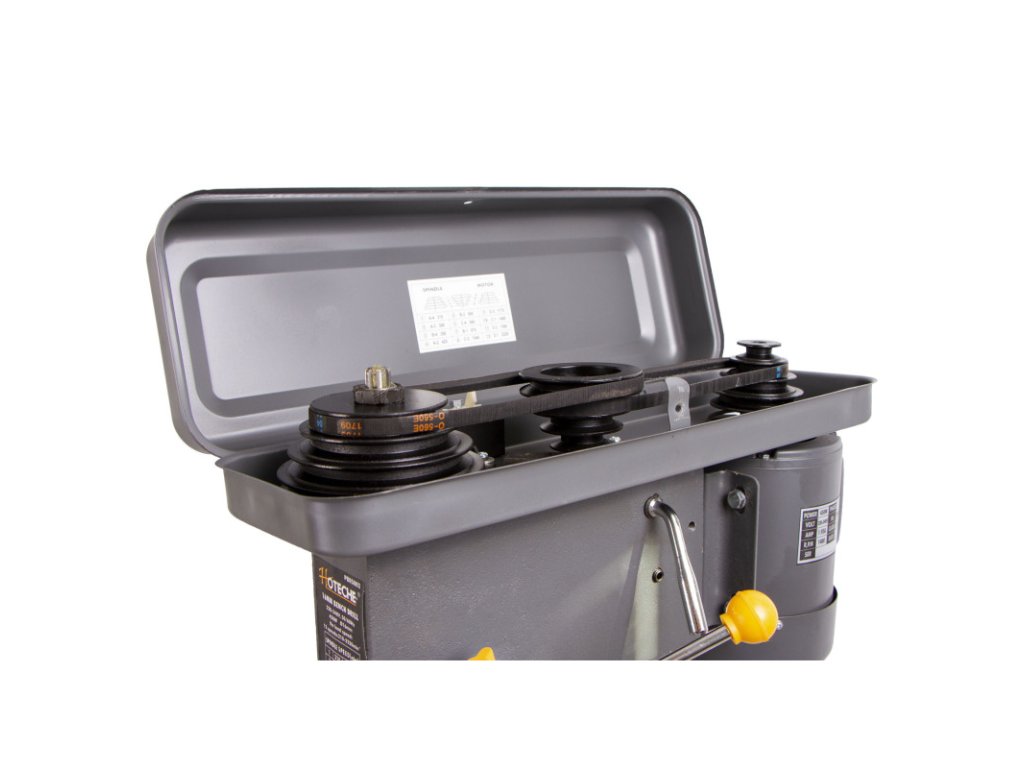 Svislý pohyb vřetena je zajištěno posuvovou pákou. Ke zvýšení bezpečnosti práce pomáhá výklopný bezpečnostní kryt sklíčidla, který Vás ochrání od možného odlítnutí špony a tím újmě na zdraví. Svislý posuv sklíčidla je možné omezit za pomoci závitové distanční hřídele s měřítkem.