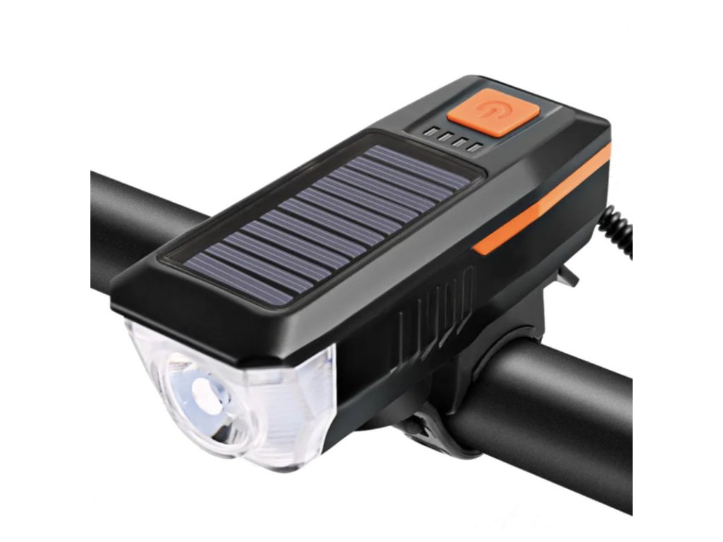 Solární LED přední bílé světlo + zvonek na kolo a koloběžku - oranžová