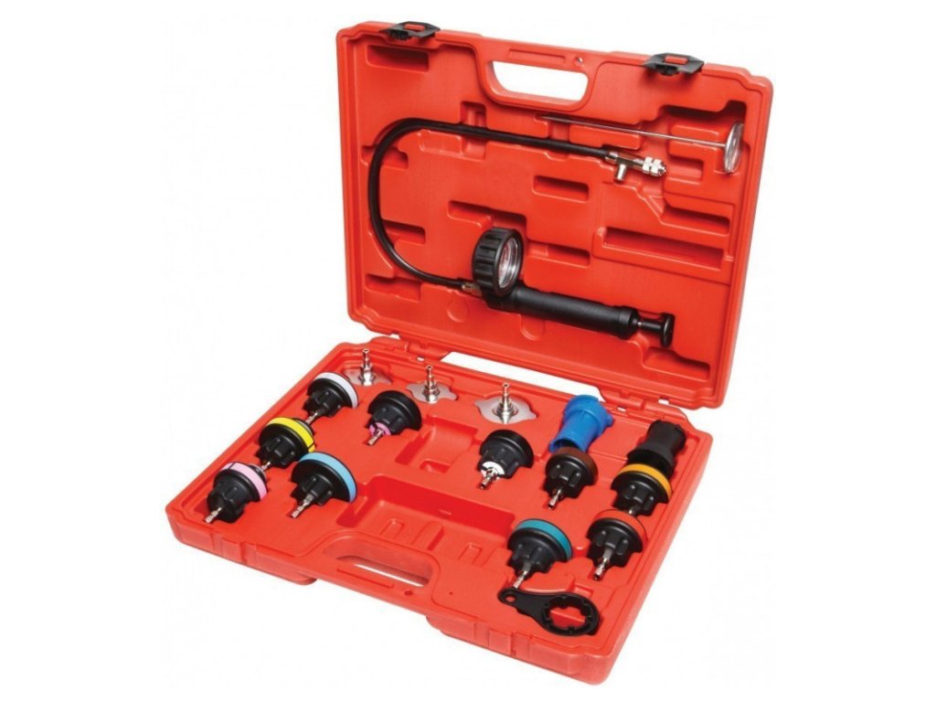 Po výběru vhodného adaptérů a jeho zašroubování ke chladící soustavě připojíme pumpičku a natlakujeme na 10 - 15 psi nebo podle specifikace výrobce vozu a sledujeme zda tlak neklesá.