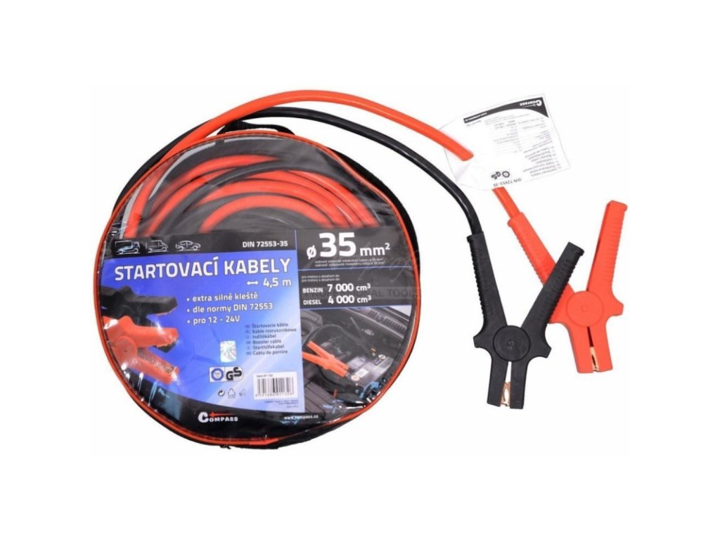 Vysoce kvalitní startovací kabely odpovídají požadavkům evropské normy DIN 72553-35 a jsou způsobilé pro napětí od 12V do 24V. Kabely jsou vyrobeny z mědí potažených hliníkových kabelů, které jsou izolovány a vybaveny kompletně izolovanými kleštěmi pro připojení k akumulátoru.