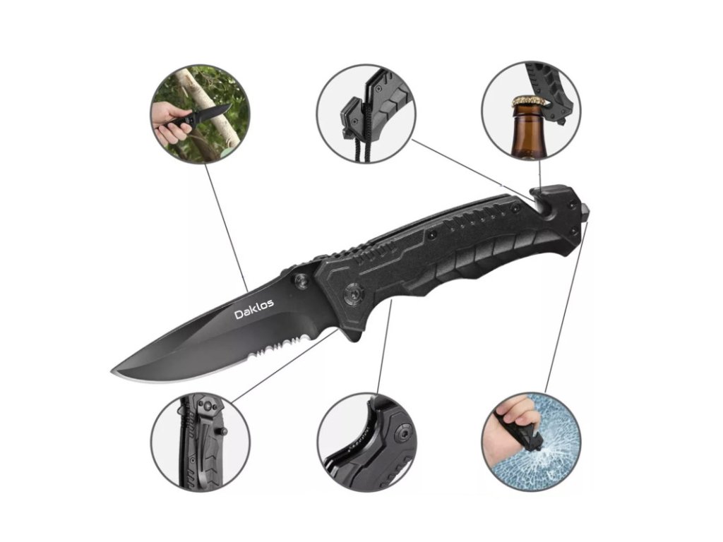 1 x Nůž 5 v 1 - klasická čepel, pilka, hrot pro rozbíjení skla a křehých tvrdých materiálů, řezák lana, otvírák