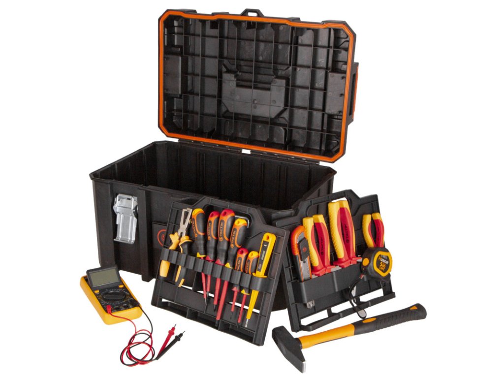 V sadě naleznete základní nářadí pro elektrikáře jako jsou kleště, elektrikářské šroubováky, digitální zkoušečka napětí, digitální multimetr a další praktické nářadí pro elektrikáře.
