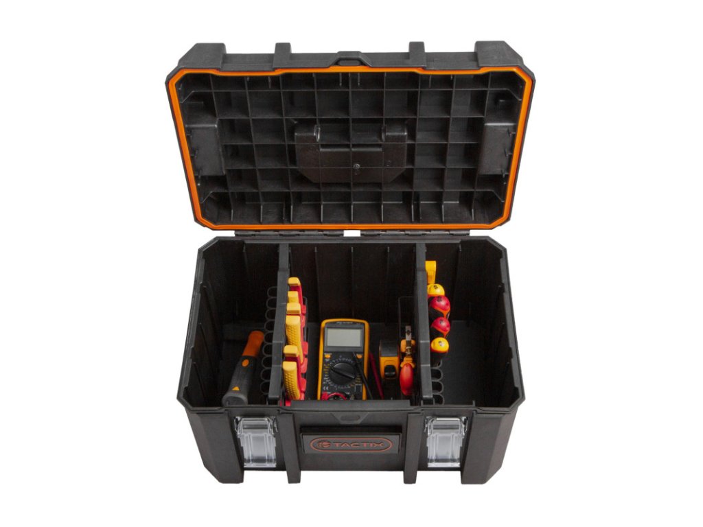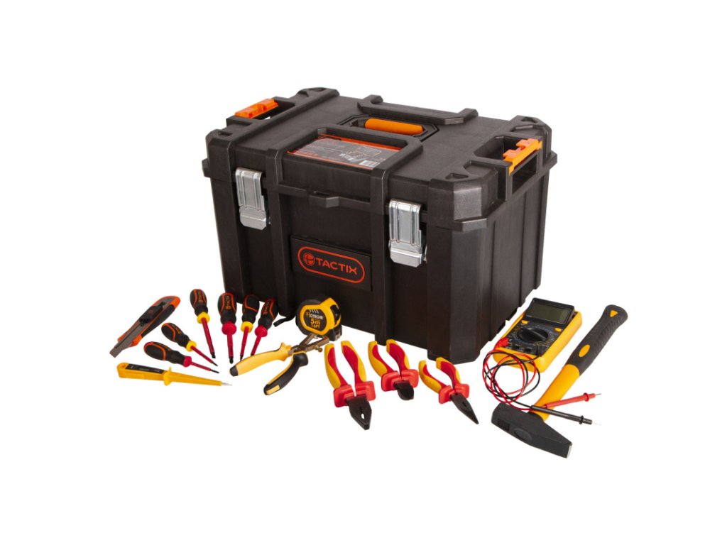 Sada 15 ks nářadí pro elektrikáře od značky Tactix a Hoteche je uložena ve vodotěsném plastovém kufru Tactix, který si můžete pořídit také samostatně.
