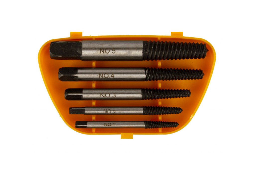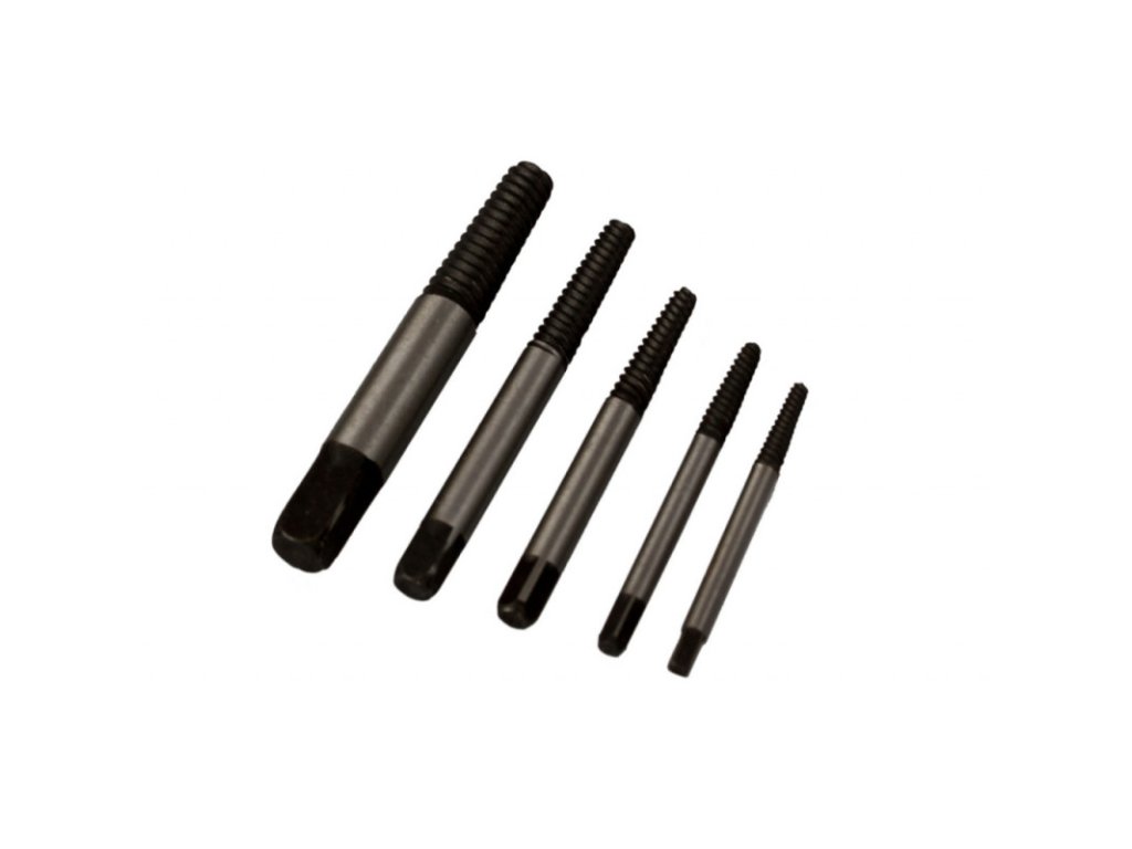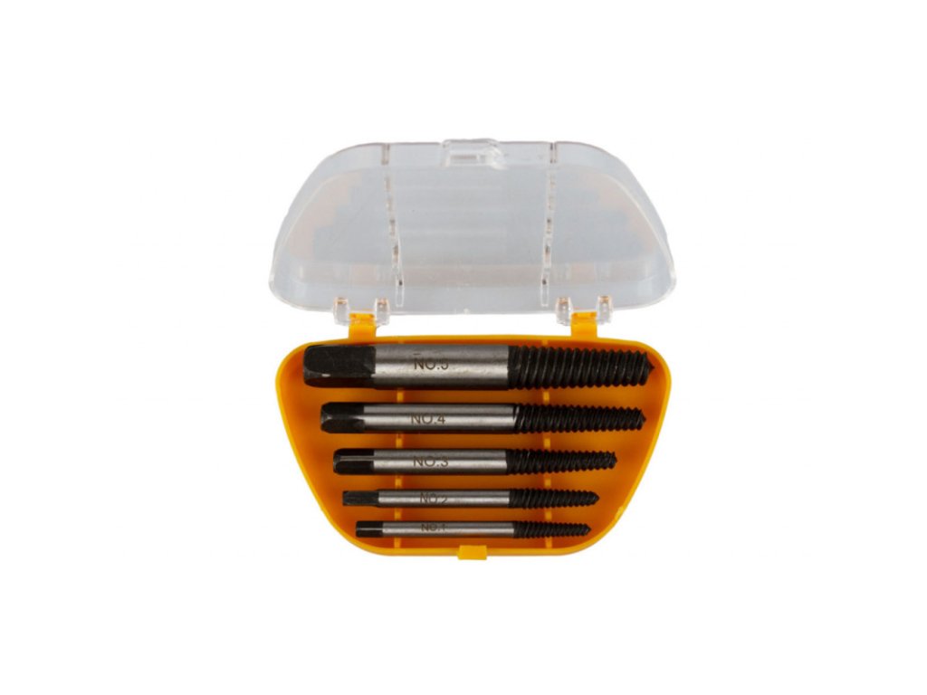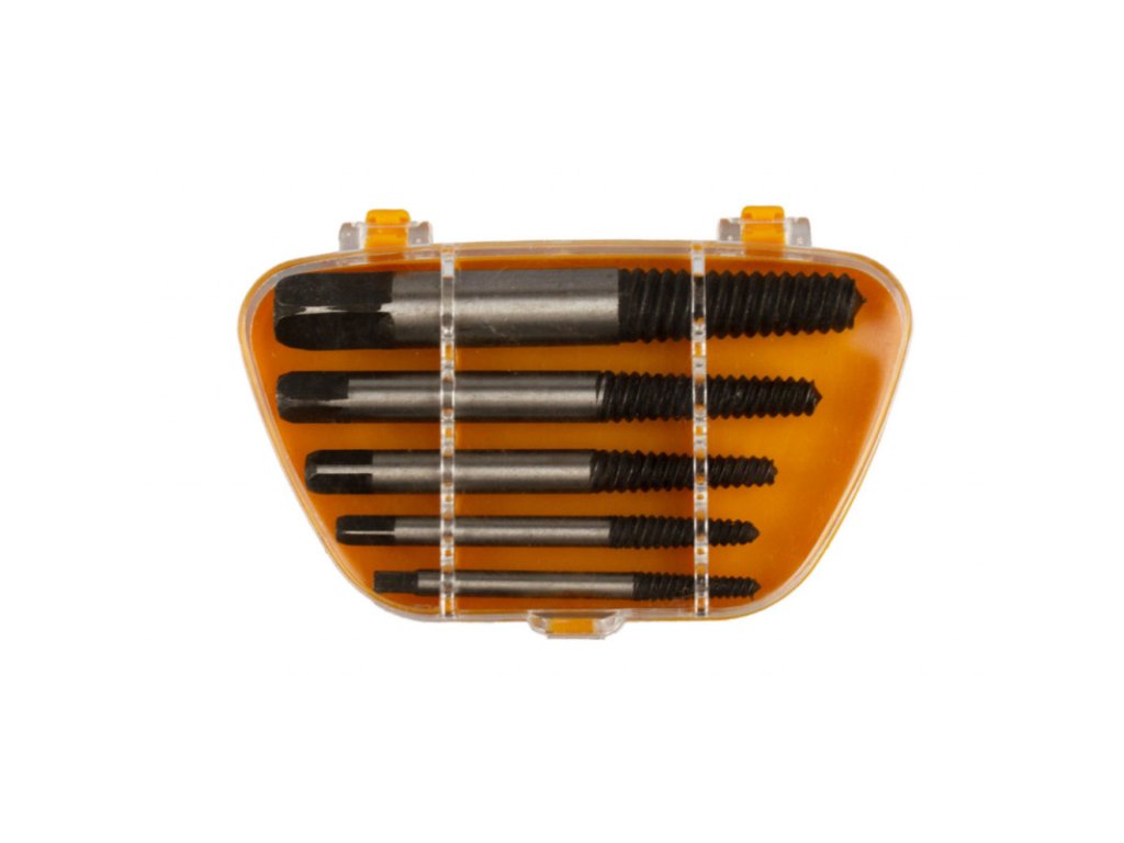 Vytahováky zalomených šroubů v sadě 5 kusů přehledně uložených v plastovém boxu. Sadu využijete k vyproštění ulomených šroubů a čepů s velikostí závitu M3 - M18.