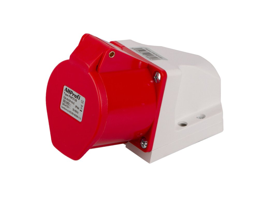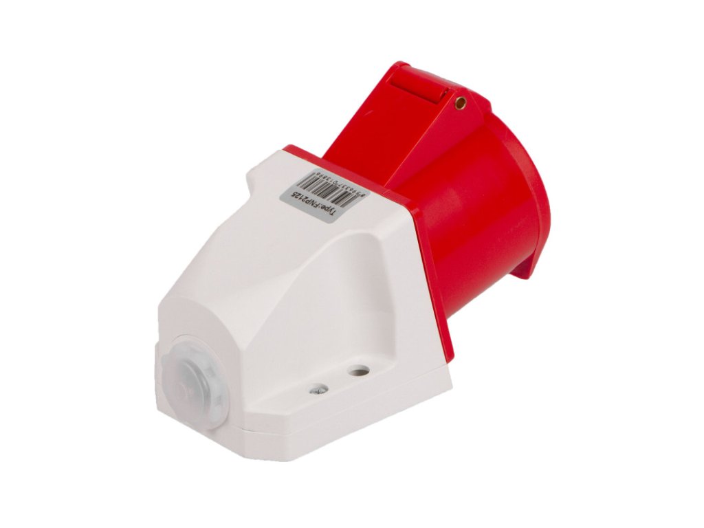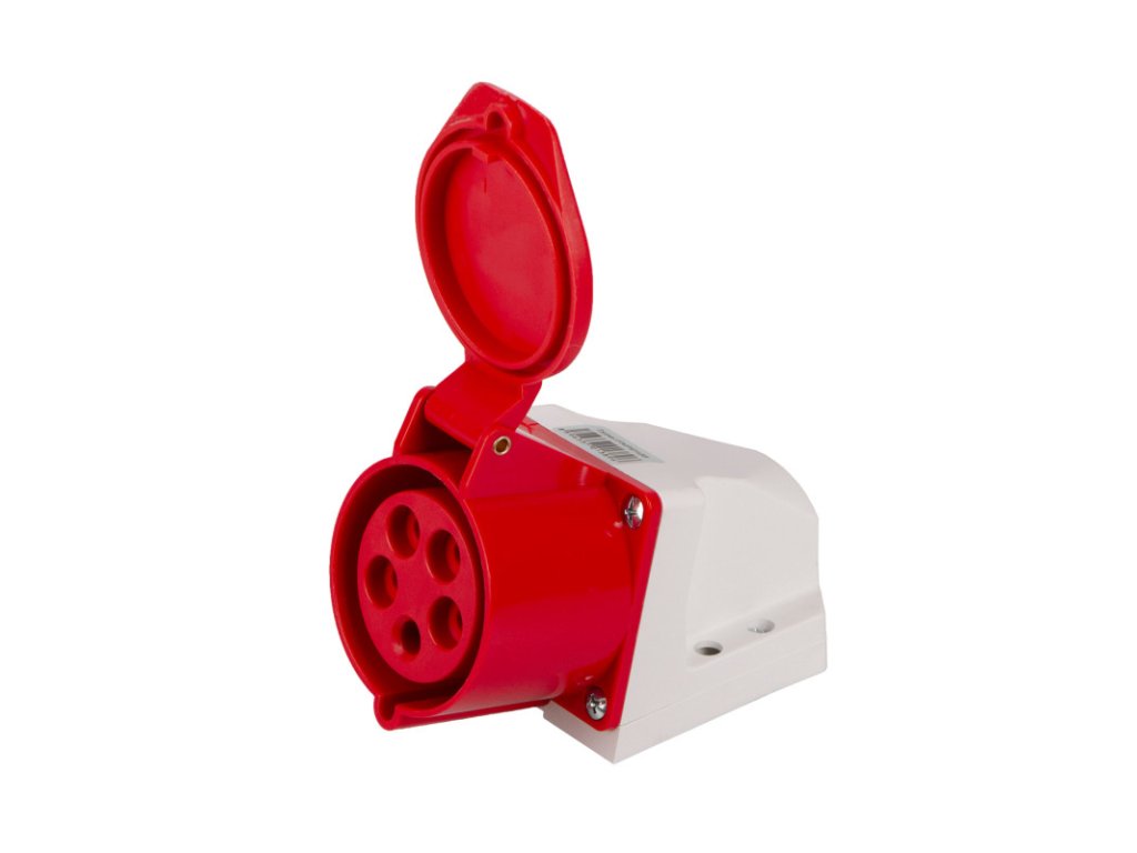 Průmyslová zásuvka na třífázový proud 380 V vhodná pro umístění na zeď.